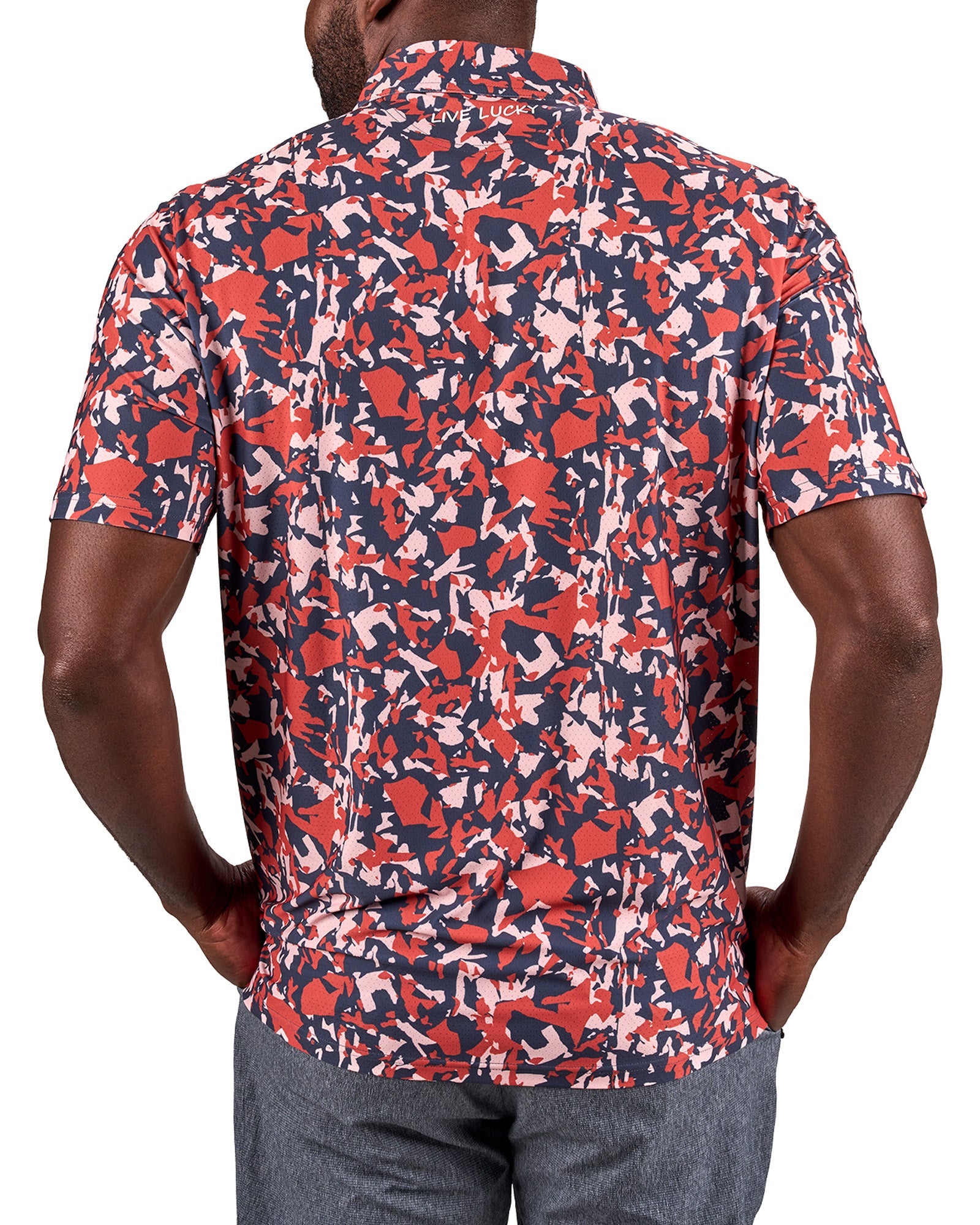 Our Camo Mix polo in brandy features a fun pattern in shades of moody blue and orange. Crafted from a poly blend performance mesh, it offers breathability, moisture-wicking capabilities, and 4-way stretch. With low shrinkage and shape retention technology, it’s your go-to for all-day comfort and style.